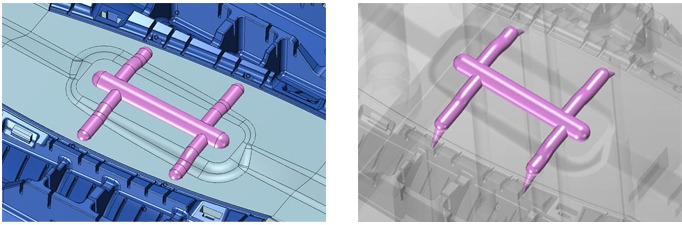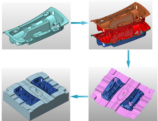 원하는 형상을 3D 모델로 구현할 수 있습니다. 또한 금형설계에 필요한 자동 파팅(Parting)과 2축-5축 CAM 경로 시뮬레이션 등